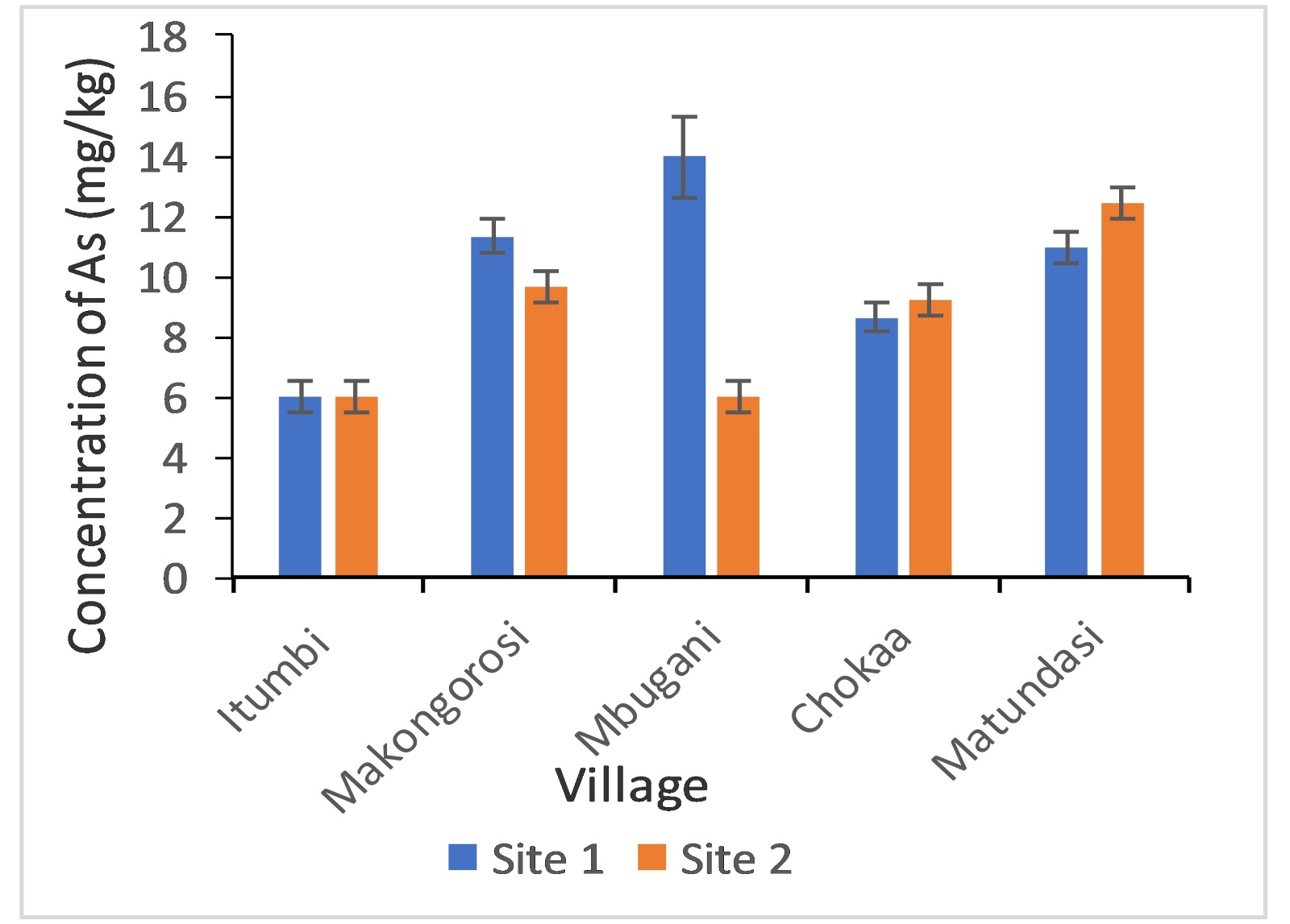 The concentration of As at the tailing heap (Figure 8) ranged from 0.78 mg/kg to 1.83 mg/kg, where all concentrations were within the allowable limit. The highest concentration was recorded in Chokaa village, while the lowest concentration was recorded in Itumbi village.