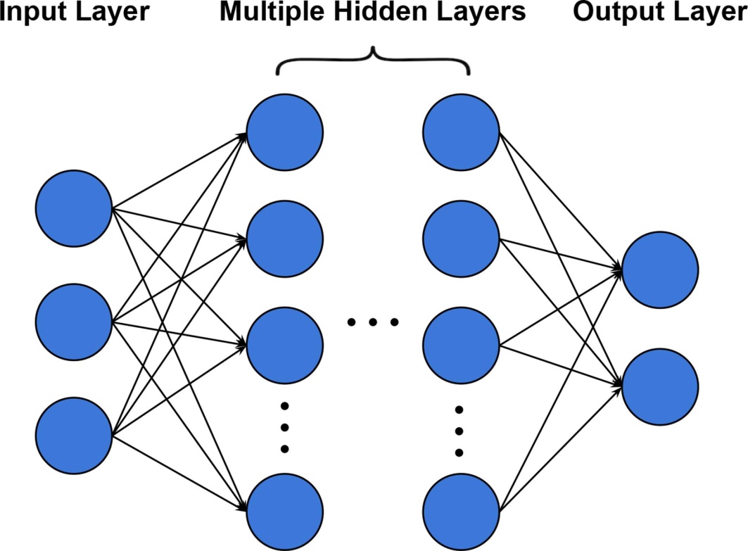 Figure 1. Simple representation of a DNN with an input layer, multiple hidden layers, and an output layer. Each circle represents a neuron. The lines denote weighted connections that transmit signals between neurons, and the dots indicate that many more hidden layers can be stacked in between. The output layer produces the final result of the network.