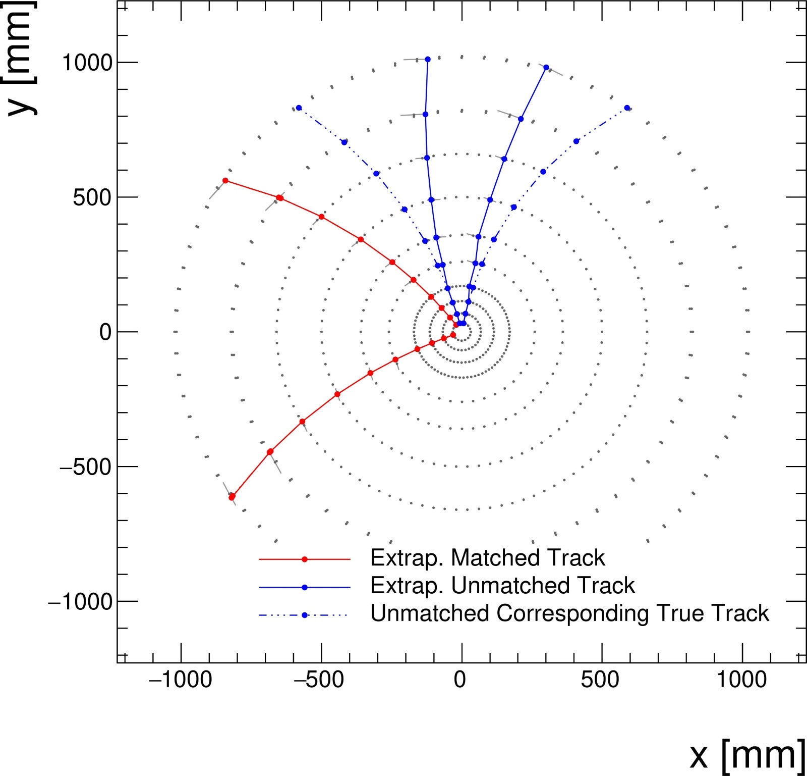 Figure 2. Charged particle tracking is illustrated: hits in the detector (dots) are systematically connected to reconstruct particle trajectories. Reproduced from Fig. 5 of [36].