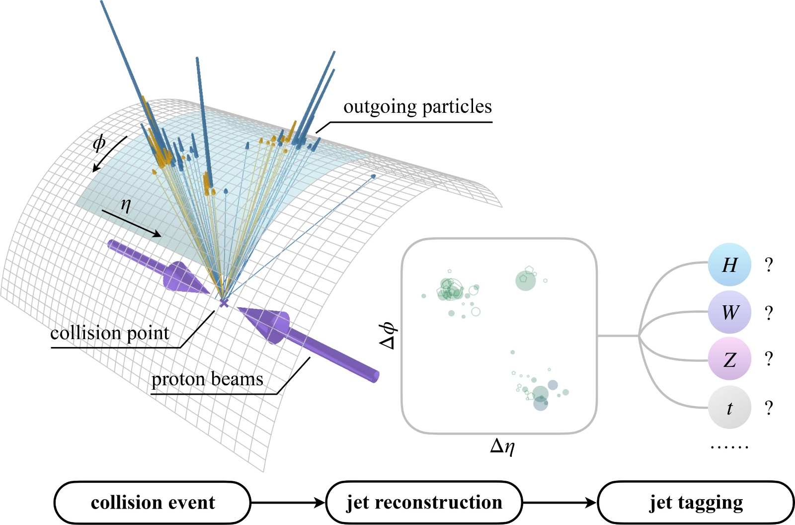 Figure 3. Jet tagging at the CERN LHC. Proton-proton collisions produce jets reconstructed by detector systems. Jet tagging classifies these jets and identifies their origin (e.g., Higgs, W/Z, or top). Reproduced from Fig. 1 from [47].