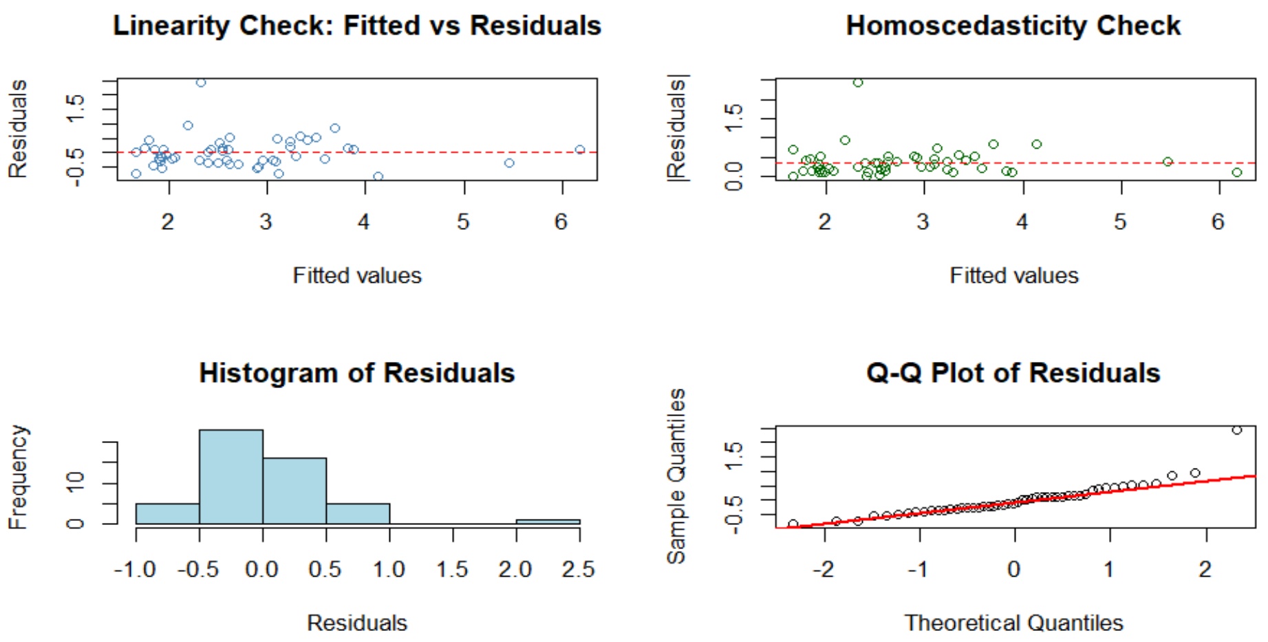 (f) Homoscedasticity: Homoscedasticity was assessed using the residuals versus fitted values plot. A consistent uniform spread of residuals across all fitted values supports the assumption of homoscedasticity, whereas systematic patterns or widening/narrowing spreads indicate heteroscedasticity [19]. To further validate this assessment, Levene’s test was applied. The test statistic is given by: