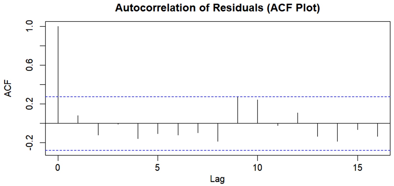 (c) Independence: To assess the assumption of independence, an autocorrelation function (ACF) plot of residuals was observed. The ACF plot shows the correlation of residuals at different lags. The absence of significant autocorrelation is indicated when all correlation values lie within the 95% confidence bounds. Deviation beyond these bounds suggest temporal dependence in the residuals, in which case model adjustments such as incorporating autoregressive correlation structures may be necessary.