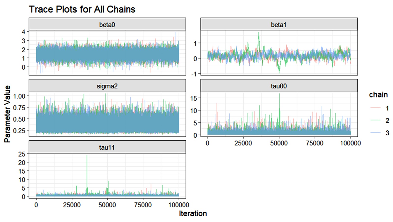 Figure 5 presents the trace plot for all chains to further validate the convergence test results. As observed all chains mix well with the coloured lines overlapping densely without visible trends or drifts. The chains appear to have stationary behaviour with no persistent trends or divergences across iterations. Notably, for variance parameters the occasional spikes are normal but are not sustained, this does not indicate poor convergence. Random effect variances converged though with mild variability which is common in hierarchical models [32].