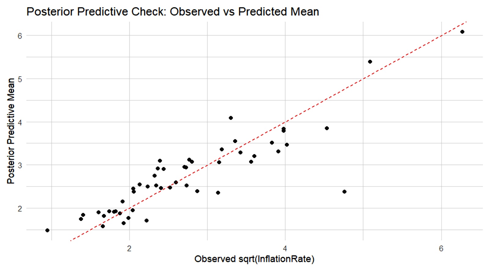 As shown in Figure 6, the close clustering of points around the 45˚ diagonal confirms accurate predictions though mild underestimation of extreme inflation values is observed.