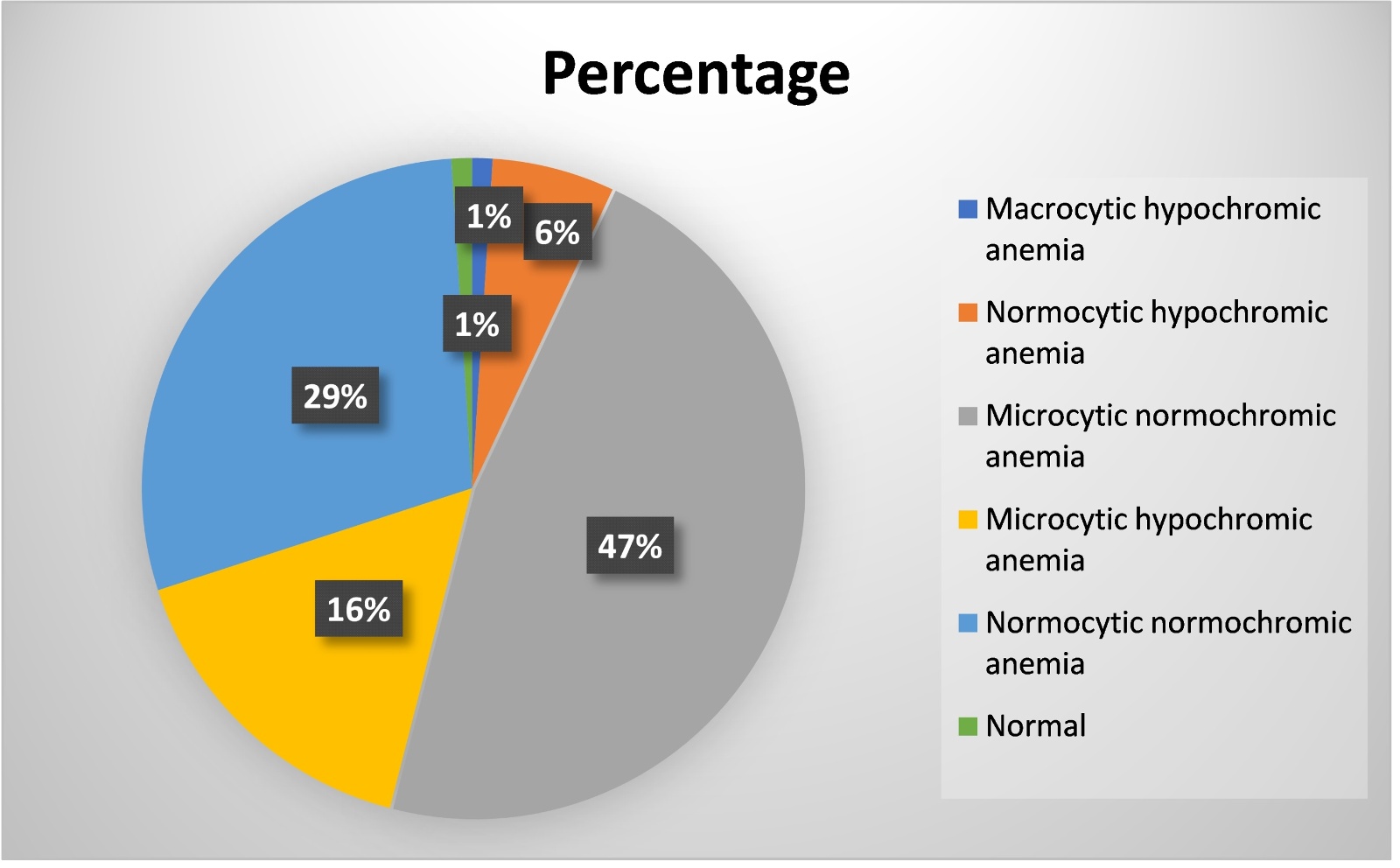 The mean hemoglobin level before transfusion was 5.1 ± 2.8 g/dL, and 8.1 ± 2.9 g/dL after transfusion. The mean erythrocyte transfusion yield (ETY) was 1.01 ± 0.5. Before transfusion, severe microcytic normochromic anemia represented 47% of cases, while after transfusion, moderate microcytic normochromic anemia was found in 56.1% of cases. The distribution of children according to anemia type before transfusion is shown in Figure 1, and biological parameters before and after transfusion are presented in Table 1.