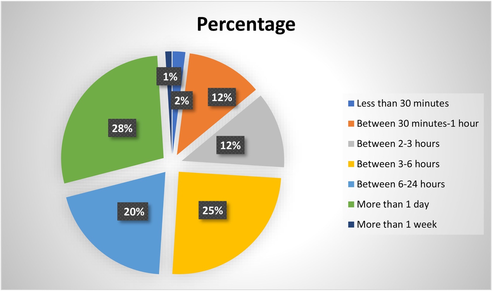 Packed red blood cells (PRBCs) were the most frequently used blood product (93.5%). Most transfusions (71%) were performed within 24 hours of the request. The mean volume of PRBC transfused was 153.5 mL, with 63.4% of bags ranging between 100 and 300 mL. In neonatology, 44.4% of transfused volumes ranged between 25 and 60 mL. The mean transfusion rate was 1.9 mL/min, with extremes of 0.13 and 8 mL/min. The duration of transfusion was between 30 minutes and 1 hour in 40.6% of cases. The majority of children (88.4%) received a single transfusion. Figure 2 illustrates the delay between the request for blood products and the transfusion.