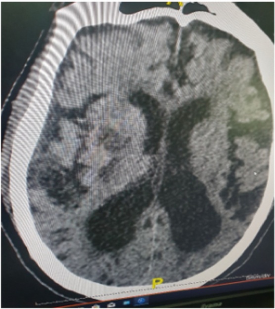 Figure 1. Right capsulolenticular hypodensity in the deep Sylvian territory consistent with ischaemic stroke.