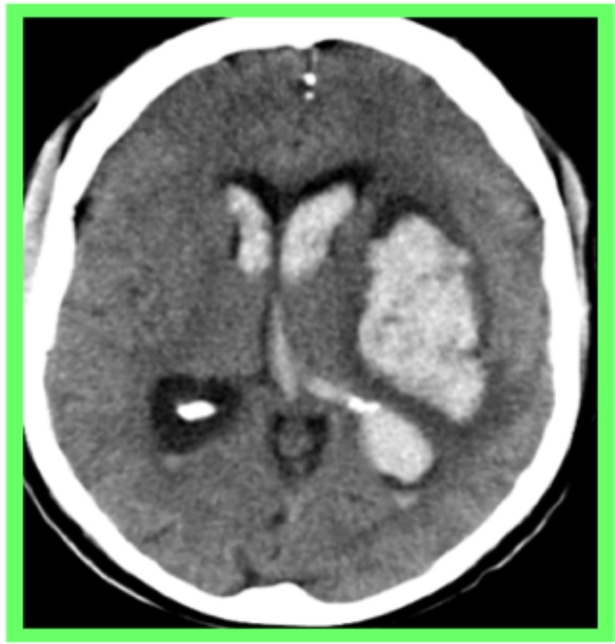 Figure 2. Left capsulo-thalamic hyperdensity surrounded by perilesional oedema and ventricular contamination suggestive of haemorrhagic stroke.