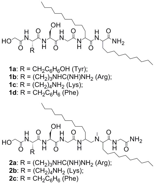 Lipopetides 1a-d possessed only natural peptide bonds, whereas the lipopeptide derivatives (2a-c) were synthesized with N-methylated dilipidic residue to increase the biological stability. In both cases, to prevent the degradation of the building blocks by exopeptidases, glycolic acid was attached to the N-terminus and C-terminus was