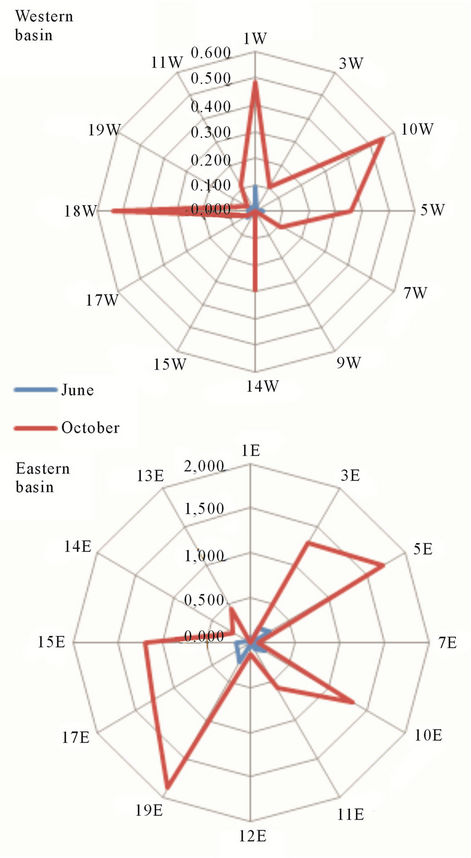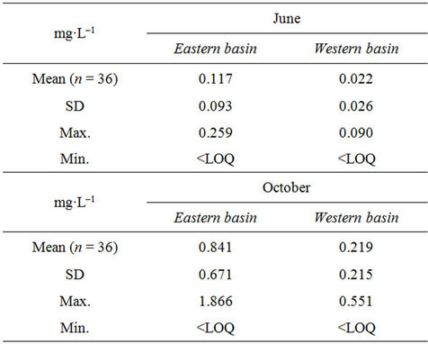 In Figure 2 MBAS levels measured in each sampling stations for both Western and Eastern basins are reported as mean values (n = 3) measured in June and October.