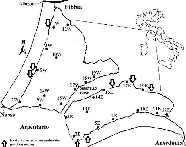 It is one of the largest brackish lagoons of the Western Mediterranean characterized by a poly-hyperhaline feature. The total surface area is about 27 km2, with an average depth of 1.2 m. The lagoon comprises two communicating ponds (named Western and Eastern) separated by the Orbetello urban settlement. Lagoon basins are separated from the open sea by two sandbars named “Giannella” (from Albegna river to Nassa canal) and “Feniglia” (from Argentario Mountain to Ansedonia canal). During the greatest part of the year (from April to October) lagoon-sea water exchanges are human managed and directed by artificial pumps from two water inlets located in the Western pond towards one water outflow sited in the Eastern ones. This produce a geographically-oriented water flux from the Western toward the Eastern basin.