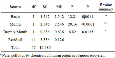 Results obtained by the univariate routine calculated on MBAS levels are summarized in Table 1. Means, range of fluctuation (minimum and maximum values) and standard deviations (SD) are reported grouping data separately for both factors of interest (month and basin) with an n = 36 associated to each statistic.