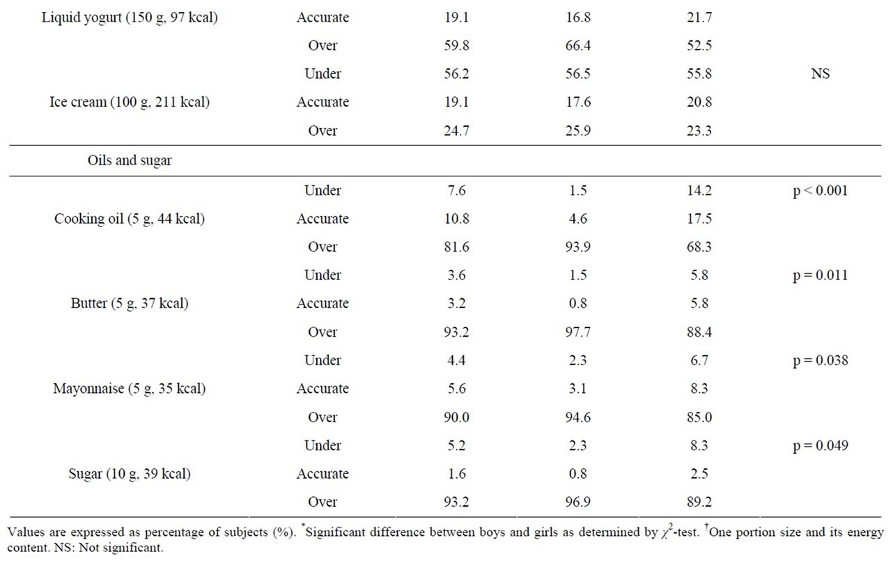 Among the 32 typical foods, there was a significant gender difference in the estimation of the calories of 13 foods. Compared with the male students, a higher proportion of female students provided the accurate calorie estimation for cooked rice (p < 0.05), noodles (p < 0.01), sweet potatoes (p < 0.05), spinach (p < 0.05), mandarin orange (p < 0.05), and mackerel (p < 0.05). A higher proportion of female students provided calorie over-estimation for potato (p < 0.01) and milk (p < 0.01). For yogurt (p < 0.05), cooking oil (p < 0.001), butter (p < 0.05), mayonnaise (p < 0.05), and sugar (p < 0.05), a higher proportion of male students provided calorie overestimation than that of female students.