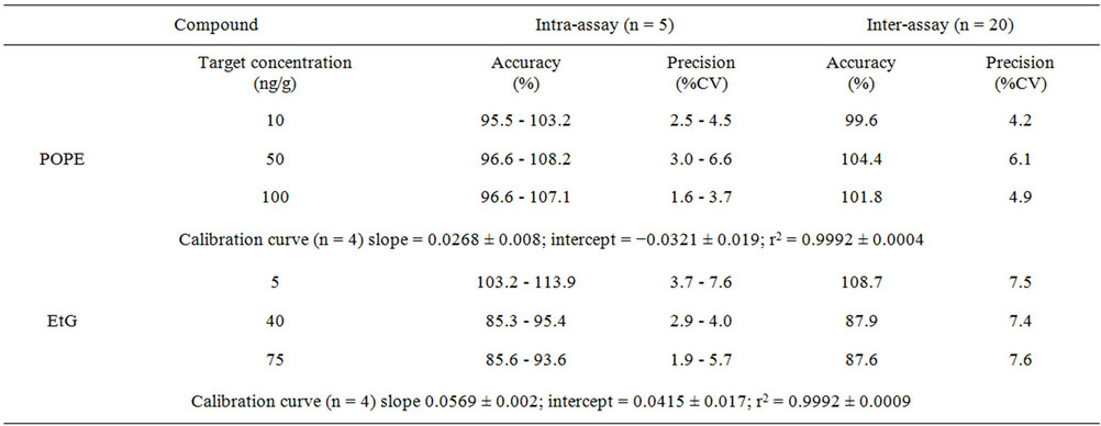 Table 2. Precision, accuracy, and linearity of methods for the detection of POPE and EtG in UC.