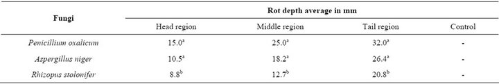 Susceptibility of yam regions to fungal attack was carried out by taking cylindrical cores of 1 cm deep aseptically from the “head”, “middle” and “tail” regions of each yam tuber with a 5 mm cork-borer. Four millimeter disc of 7 days old fungal cultures were placed, fungus first into the holes in the tubers, before the cores of the yam from the tubers were replaced after about 2 mm have been cut off to compensate for the thickness of the Agar inoculums. Petroleum Jelly was used to cover the replaced cores to prevent contamination. Each experiment for the tuber regions was replicated three times. Controls were inoculated with plank sterile agar and all inoculated tubers were incubated at room temperature for four weeks; after which they were sliced through the site of inoculation and rot depth measured.