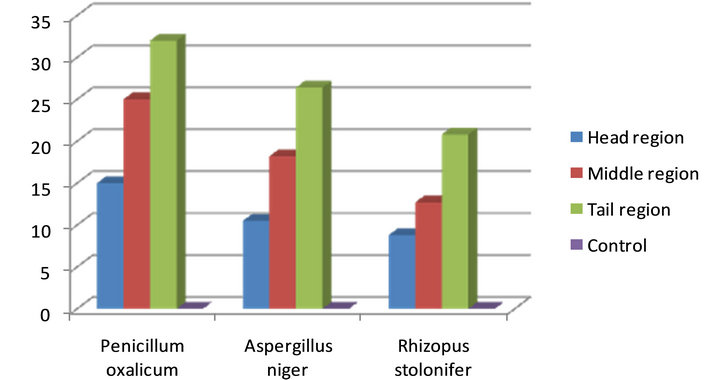 The tail region of the yam tubers showed higher susceptibility to the fungal pathogens (32.0 mm, 26.4 mm and 20. 8 mm) for P. oxalicum, A. niger and R. stolonifer respectively; these results were significantly different from the result gotten from the middle and the head regions. Although the susceptibility of the middle region was less than that of the tail region, by the three fungi isolates (25.0 mm, 18.2 mm and 12.7 mm) for P. oxalicum, A. niger and R. stolonifer respectively; and this result was still higher from those observed at the head region (15.0 mm, 10.5 mm and 8.8 mm) for P. oxalicum, A. niger and R. stolonifer respectively; however, but there was no difference in susceptibility of the middle and that at the head regions (Figure 1).