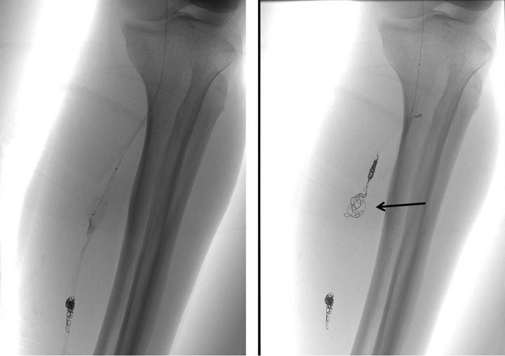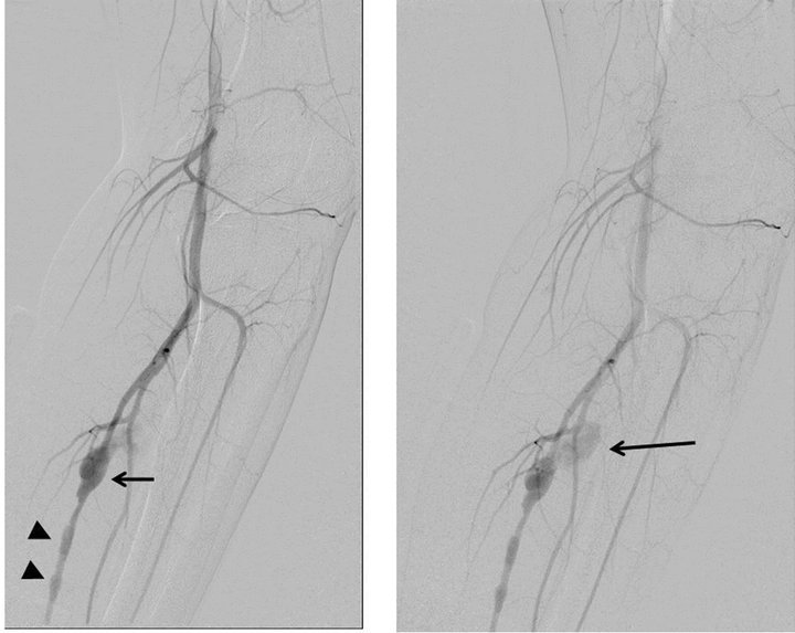 Figure 4. Left: Posterior tibial arteriogram during the endovascular procedure shows three detachable coils deployed at the distal end of irregular segment. Microcatheter tip is positioned within the proximal fusiform aneurysm. Right: Digital radiogram reveals a complete internal trapping by detachable coils. Rough coiling indicates the fusiform aneurysm (arrow).