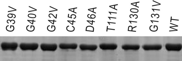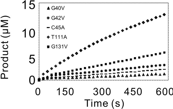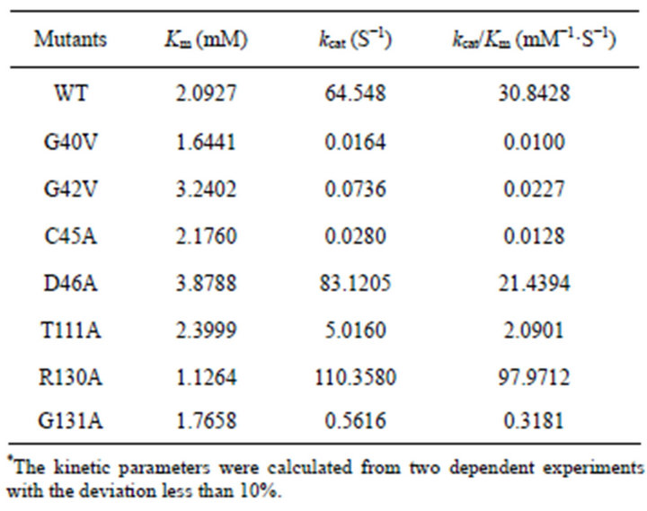 The kcat/Km values of G40V, G42V decreased by about 3084 and 1358-fold, which was largely due to change in kcat. C45A showed the similar kinetic behavior with G40V and G42V, with a decrease in kcat by about 2305- fold. For the above three mutants, Km value did not change obviously. However, replacement of Asp46 with Ala did not result in obvious change in these parameters.