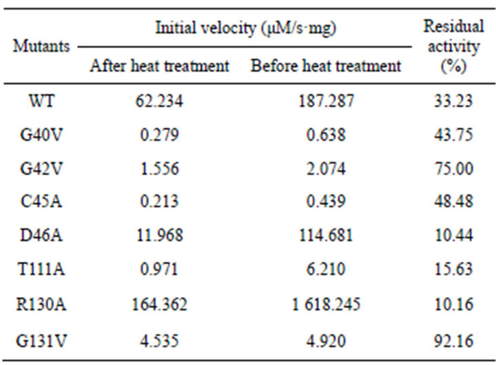 After heat treatment, catalytic activity was reduced at different extent for WT and all the mutants. The residual activity of WT decreased by 33.23% in comparison to the initial activity after heat treatment at 50˚C for 10 min. Therefore, D46A, T111A, or R130A became more heatlabile than WT, with only residual activity of 10.44%, 15.63% or 10.16%, separately. It is noted that the thermostability of G131V increased significantly, which retained 92.16% of the initial activity after heat treatment. However, the other mutants like G40V, G42V, and G45V showed very low activity after heat treatment.