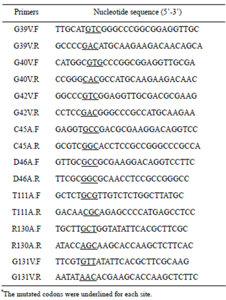 In this work, eight amino acid residues were chosen for site-directed mutagenesis. The corresponding mutants were constructed using the QuikChange mutagenesis method. After the desired mutations confirmed by DNA