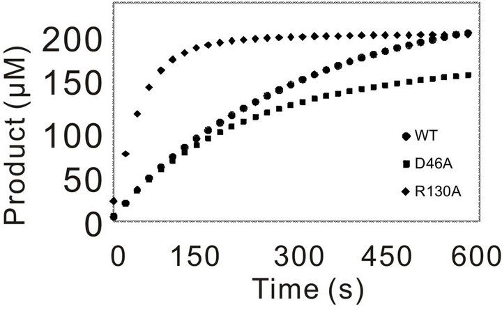Initially, the activity of WT and the mutants was assayed using 3.57 nM of enzyme for WT and each mutants and 0.5 mM of Pro-pNA as substrate. In compareson with WT, mutation of the residues (G39) leaded to complete loss of activity towards the substrate Pro-pNA, even with the increased amount of mutation enzyme (data not shown). The progressing curves for the other mutants and WT were shown in Figure 3. R130A showed increased activity, and D46A behaved similar