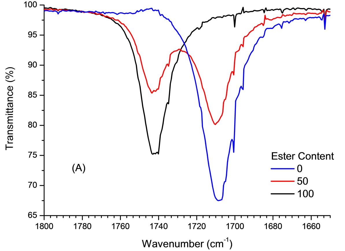 Quantification of esterification products was carried out through a calibration curve built by using prediction method through Partial Least Squares using Minitab software program employing transmittance data of spectral band of 1650 cm−1 to 1800 cm−1 of 26 samples containing known amounts of methyl oleate and oleic acid, 9 of which were used in cross-validation.