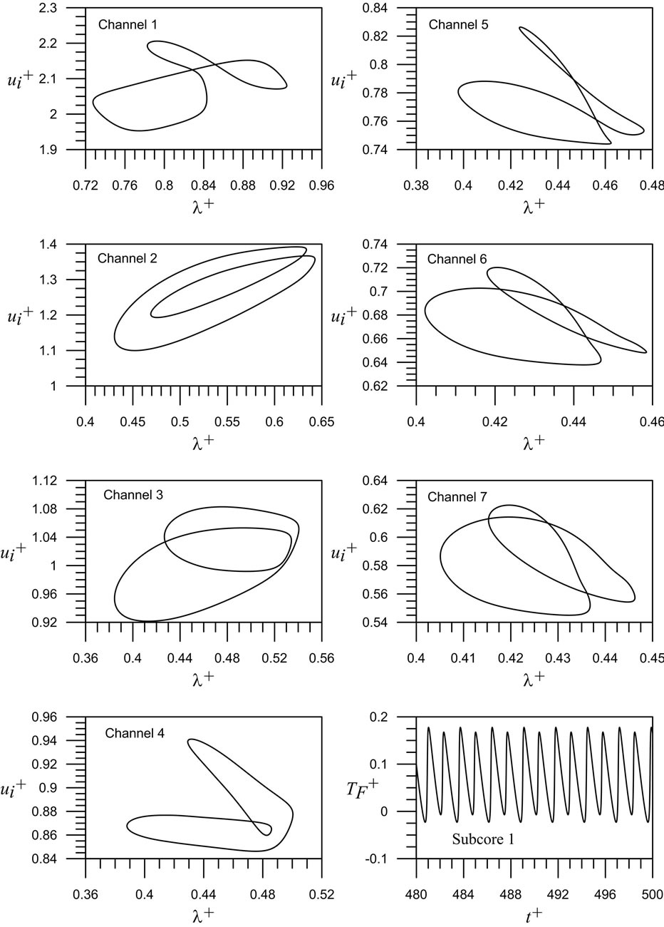 , a special oscillation type of complex P-2 (period-2 orbit) occurs in the system as illustrated in Figure 4 as a result of the channel-to-channel interactions and subcore-to-subcore neutron interactions. The results indicate that the corresponding phase diagram onto the