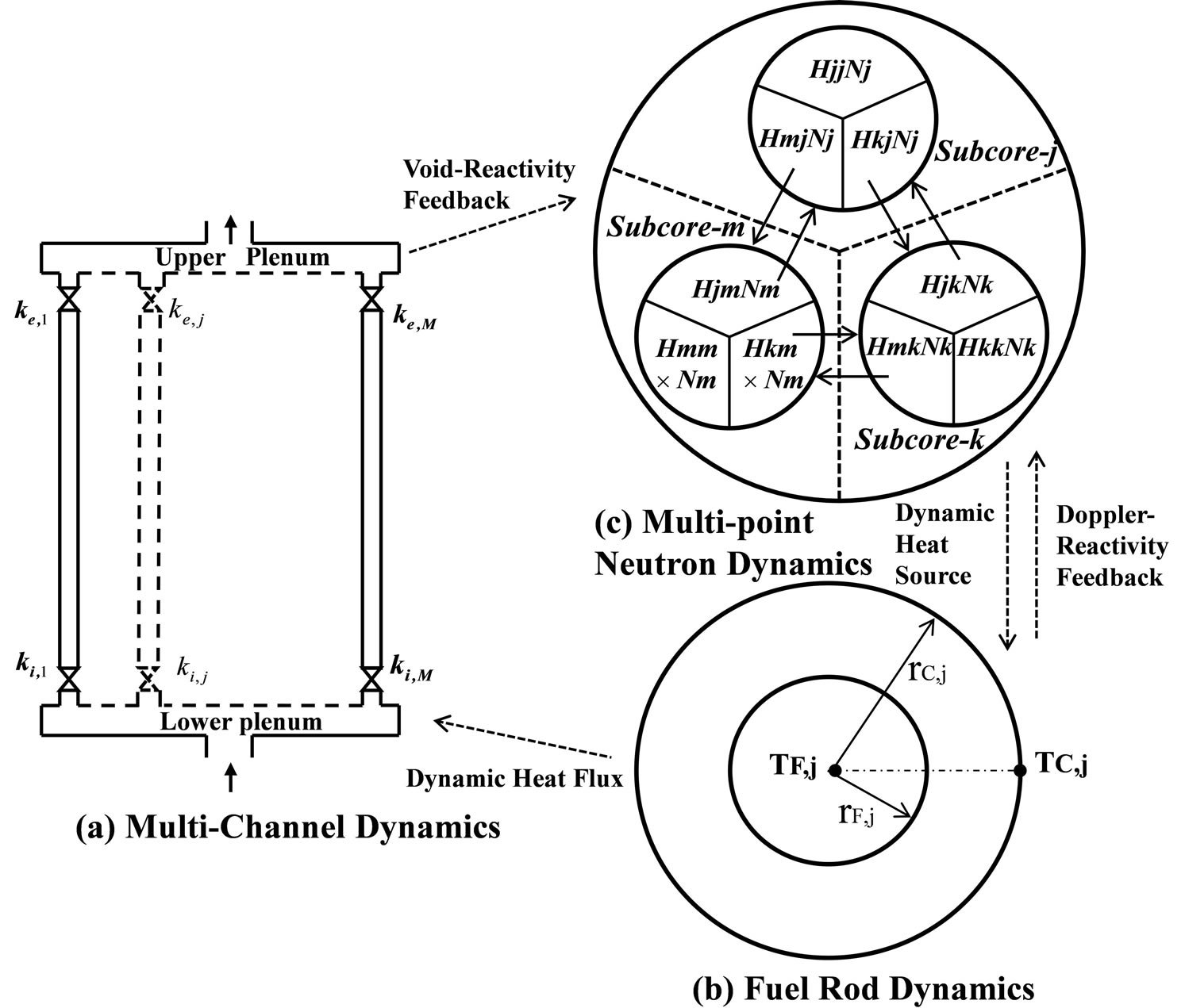 On the basis of the design of an advanced boiling water reactor (ABWR) [11], the multiple boiling channel model coupled with multi-point reactors [9] are adopted to analyze the nonlinear dynamics of the system numerically. The present study considers the multiple coupling dynamics among multiple channels, fuel rods and multi-point reactors as shown in Figure 1. The dynamics of multi-channel thermal-hydraulics may affect the dynamics of neutron field through void-reactivity feedbacks. This can further affect the dynamics of fuel rod heat transfer resulted by the dynamic heat generation rates. The dynamics of fuel rod can produce effects on the multi-channel thermal-hydraulics with the dynamic heat fluxes and on the neutron field dynamics through Doppler-reactivity feedbacks, and etc.
