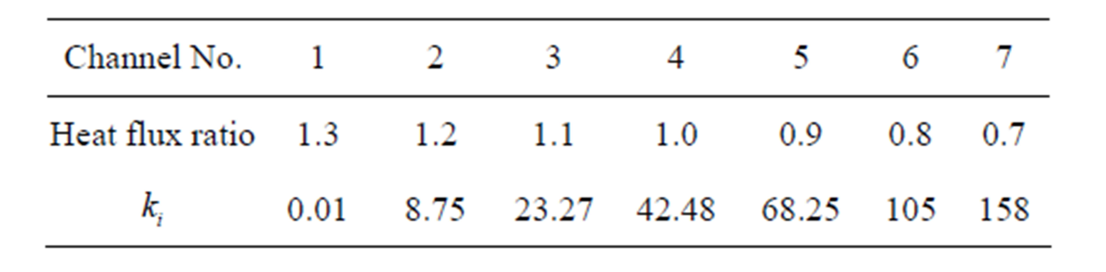 Table 1 lists the geometries and properties used in the present study. This set of data is extracted from the Pre liminary Safety Analysis Report of an ABWR [11]. For a seven nuclear-coupled boiling channel system considering in this study, a radial heat flux distribution of 1.3:1.2:1.1:1.0:0.9:0.8:0.7 is set on the basis of a given average heat flux. The inlet loss coefficient in each channel, as listed in Table 2, is selected such that all the heated channels have approximately the same exit quality at a typical normal operating condition given in Table 1.
