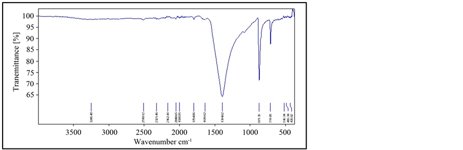 The characterization of the eggshell was performed by infrared spectroscopy (IR), scanning electron microscopy (SEM) and X-ray diffraction (XRD). Figure 1 shows the IR of the eggshell. The characteristic peaks in the IR spectrum of eggshell found at 711.68, 871.35, 1394.62, 1794.86 and 3245.48 cm−1, which coincide with those reported by Witoon [22] . The peak at 1795 cm−1 indicates the presence of C = O (stretching), the 1397 cm−1 indicates, the presence of CO groups, both are characteristic of CaCO3.
