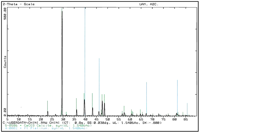 Figure 3 shows the XRD eggshell, it can see a crystal structure consisting mainly of CaCO3 calcite type.