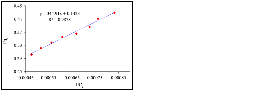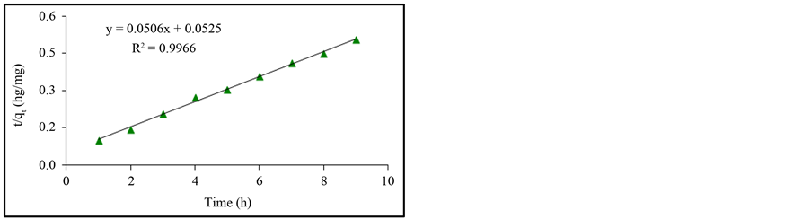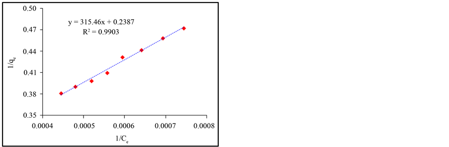 Table 1 shows the results of the models used in the adsorption process with eggshell. The factor of linear correlation was higher for the pseudo-second-order model (0.9966), so that in the adsorption process with eggshell present best fit to this model. The chemisorption in this adsorption system is apparently present [23] . Moreover, the qe value obtained experimentally (17.98 mg∙g−1) with Langmuir isotherm was closest to that obtained applying the kinetic of pseudo-second-order (19.76 mg∙g−1).