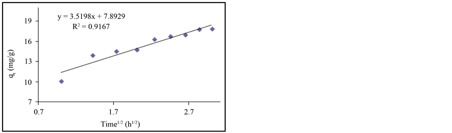 The linear correlation factor for intra-particle diffusion model (0.9167) was lower than for pseudo-first-order and pseudo-second-order models however its value is acceptable, so there are molecules in the system that can be adsorbed on eggshell following intra-particle diffusion kinetic.