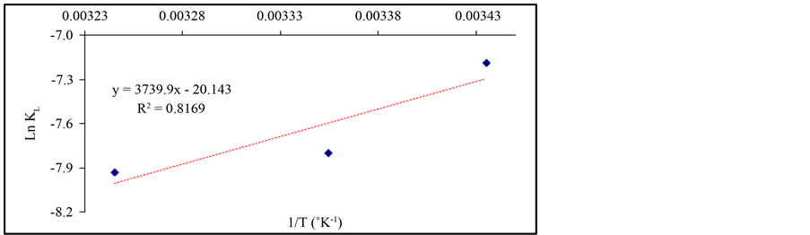 With the values of the Langmuir constants at the three temperatures the separation factors or balance parameter, RL, was calculated, Table 3. Gouamid, et al. [20] indicate that if RL = 0 the adsorption is irreversible, if 0 < RL < 1 the adsorption is favorable. Thus means that the adsorption of the adsorbates on the eggshell was favorable for all three temperatures.