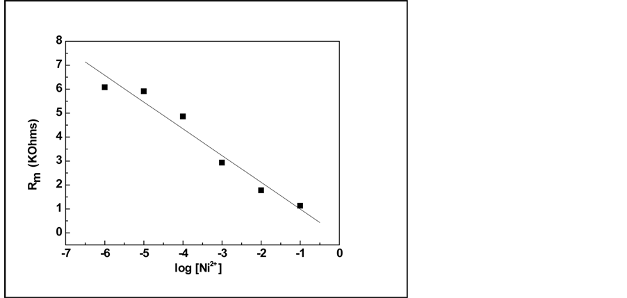 To obtain the calibration curve of the Ni2+ sensor, we have plotted the variation of Rm versus Ni2+ concentration in a semi-logarithmic scale (Figure 4). Rm corresponds to the membrane resistance obtained from the fit at different concentrations of the detected ion.