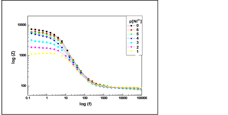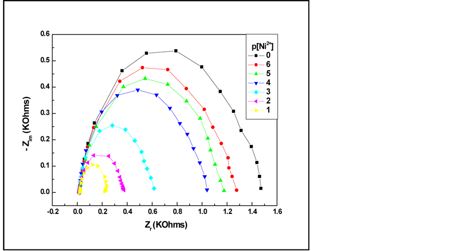 It is important noteworthy that the semi-circle decreases when increasing concentrations of nickel (in the range from 10−6 M to 10−1 M). This sequential change of the impedance with the cologarithm of nickel concentration (p[Ni2+]) indicates that the modified gold electrode is p[Ni2+] sensitive.