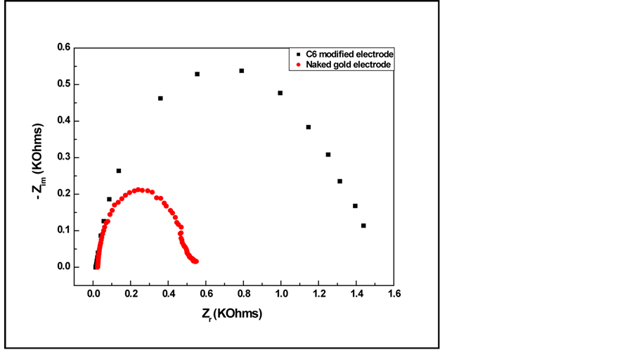 Figure 1. Nyquist plots for naked gold electrode and C6 modified gold electrode.