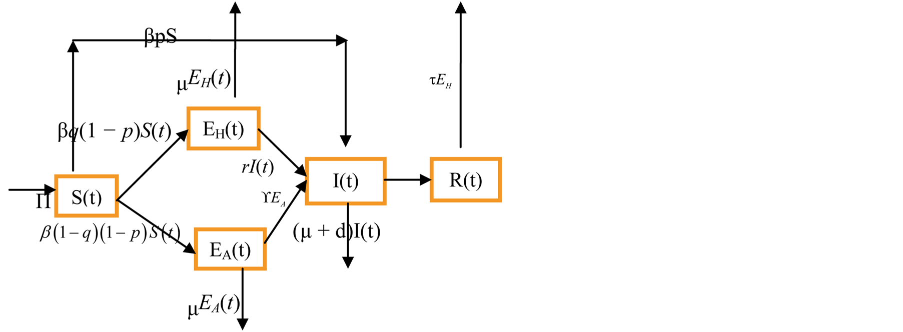 We assume that, new recruits enter the susceptible class at a constant rate, Π. The susceptible population is diminished by natural death at a constant rate