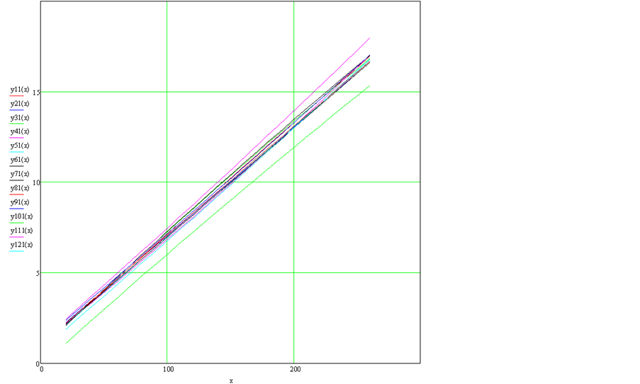 For each speed sensor 1 - 12 by using the method of least squares [5] there was determined the dependence of the rotational speed from the wind speed (Figure 4).