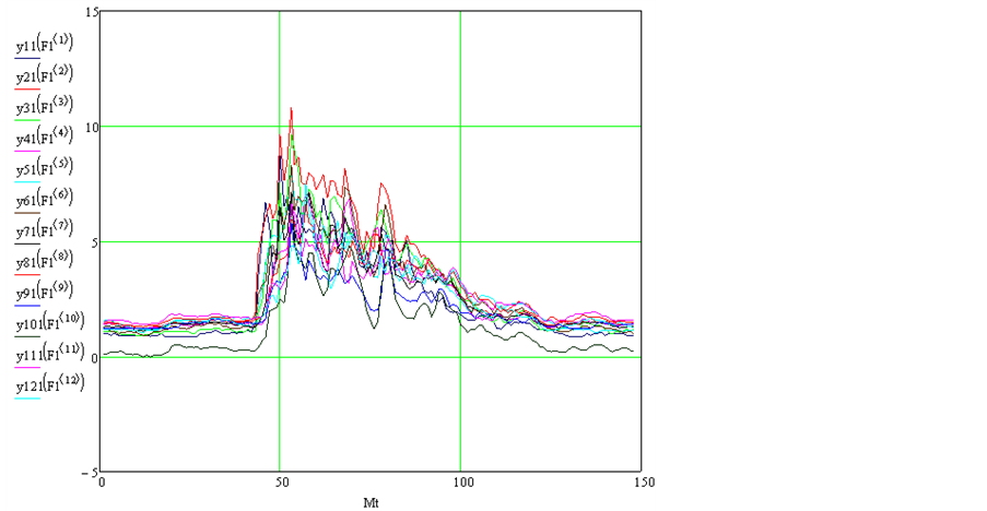 The graphs of the power of the wind flow for each sensor of the measuring system calculated by the expression (3), shown in Figure 6 in the coordinates: x-axis—seconds, vertical axis—watts.