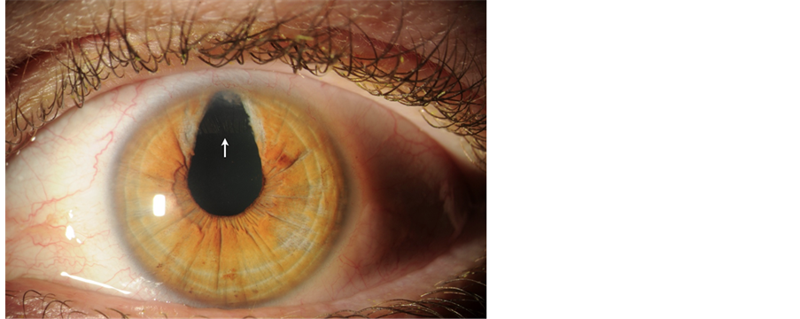 Figure 2. A slit-lamp photograph showing a large sectoral surgical iridectomy exposing the edge of the Visian ICL (white arrow).