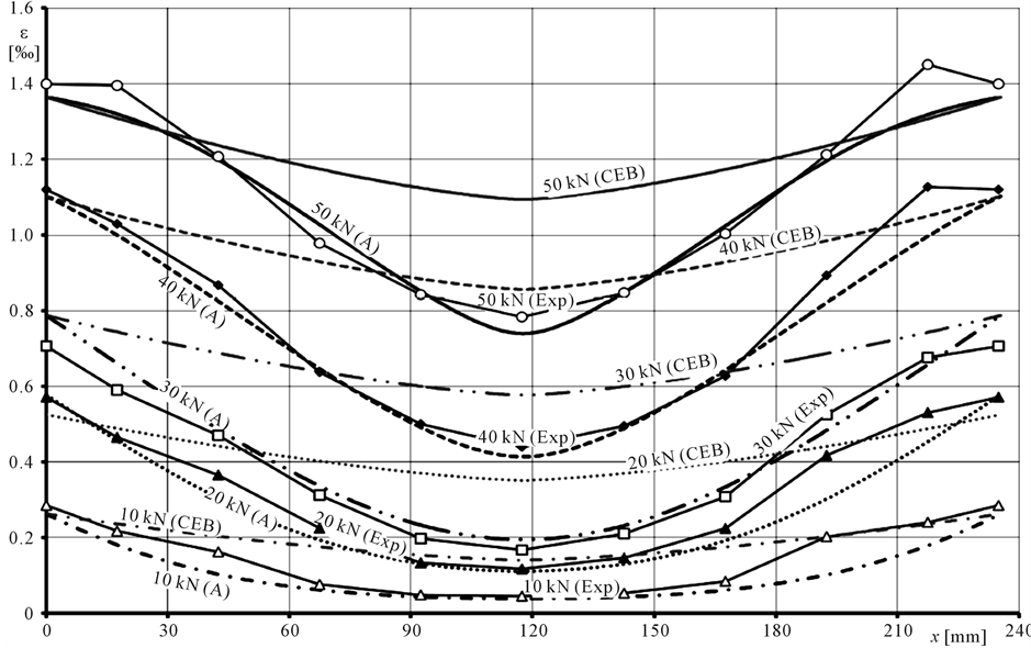 In the diagrams, for each load step, the curves representing the measured experimentally strain distributions e-x along the steel bar are compared with those obtained by the implementation, in turn, of the bond-slip correlation suggested by the CEB Model Code 90 (Figure 8) and of the alternative effective bond-slip law suggested in Figure 9. In order to facilitate the comparisons, in the figures the curves obtained adopting CEB model, designated as “CEB”, are plotted in grey, the curves obtained adopting the alternative model, designated as “A”, are plotted in black and finally the experimental ones are plotted with piecewise linear curves.