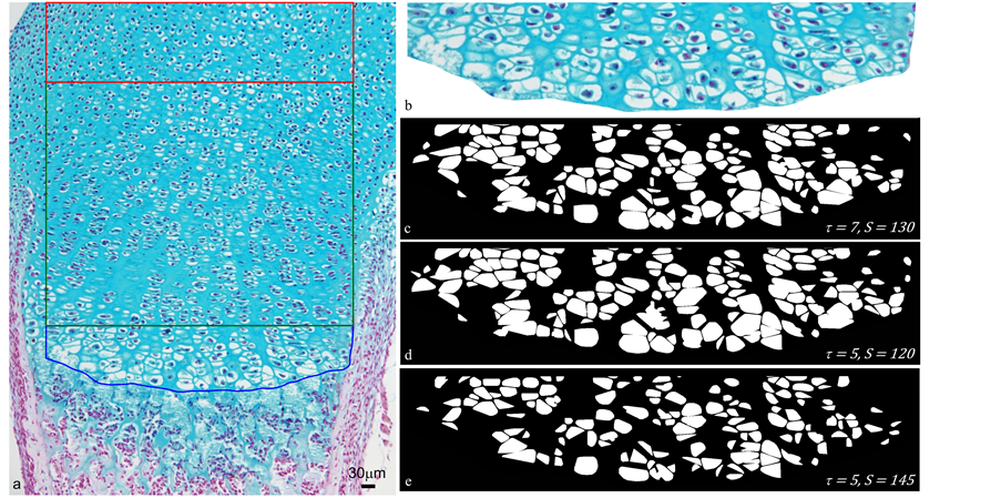The hypertrophic zone presents the highest challenge to the CDA because the cells are tightly packed and their profiles frequently touch (Figure 4(a), Figure 4(b)). The analogy of best images for different values of τ and S. (Figures 4(c)-(e)) is indicative of the synergistic effect of τ and S and that the parameters’ values are not 1-to-−1. Within the context of the relation between hypertrophic cell height and length of growth plate, bone and limb ([4] [17] ), we found small variations in hypertrophic cell height and growth plate length to mean hypertrophic cell height ratio (Figures 4(c)-(e); Table 3) for different choices of CDA parameters. In Table 3, the data are presented as mean ± standard deviation. *indicates significant difference in height with