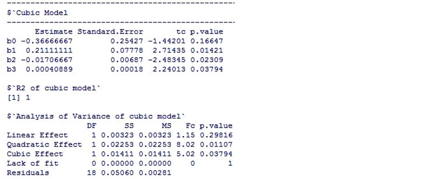 For comparison of quantitative treatments is available the routine of linear regression (by ordinary least squares) incorporated the analysis of variance. This routine fits polynomial models up to the third power, presenting individual analysis of variance and lack of fit (Figure 5).