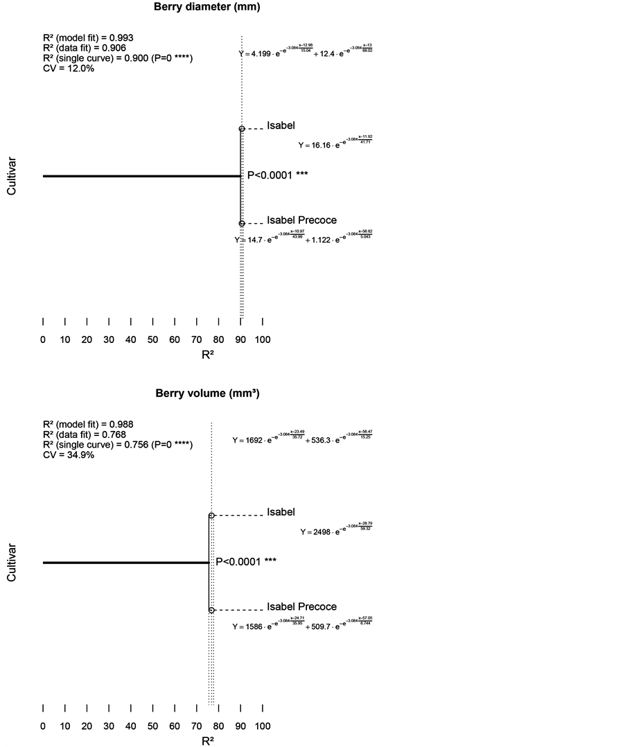Usually, the development of grapevine berries is modeled based on a symmetric double sigmoid curve pattern [44] , with a phase of rapid growth during the first four weeks after flowering. A lag phase―characterized by a smaller number of cell divisions and an increase in cell size―takes place between four and eight weeks after flowering. This development pattern has been reported for other cultivars, such as “Cabernet Sauvignon” [45] . Even though the cultivars follow similar development kinetics, “Isabel Precoce” develops fruits of smaller diameter and volume (p < 0.0001) than “Isabel” after the first growth phase, and reaches the second growth phase about 42 days earlier (measured by the difference in vérasion). The results demonstrate that the Gompertz function can be used to accurately model berry development in grapevines.