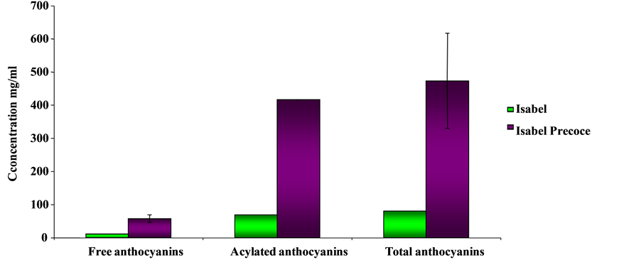 Figure 2. Quantification of anthocyanins in Isabel and Isabel Precoce cultivars. Sampling performed at 80 DAFS during the 2008/2009 season.