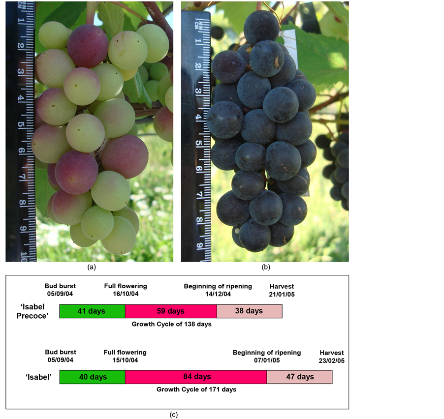 “Isabel Precoce” was identified in 1993 in a vineyard in Farroupilha, Rio Grande do Sul (Brazil; latitude: 29˚13′30″S, longitude: 51˚20′52″W) on a grapevine (Vitis labrusca L., cv Isabel) plant as a spontaneous somatic variant. The original plant was maintained in situ and cuttings were later grafted and propagated at Embrapa Uva e Vinho, in Bento Gonçalves (latitude: 29˚09′44″S, longitude: 51˚30′50″W), Rio Grande do Sul, Brazil, under the germplasm bank registration code 2526 [38] . “Isabel Precoce” plants were then followed for five production seasons to verify their phenotype, morphological and biochemical characteristics. As a result, the “Isabel Precoce” plants showed the same general phenotypic traits of “Isabel” and confirmed its early-ripening phenotypic stable feature, with an average harvest date of 33 days before its parental cultivar “Isabel” [38] . The growth cycle reduction occurs between flowering and harvest, particularly between flowering and the beginning of ripening (véraison―stage 81), when “Isabel Precoce” shows an accelerated early green berry development (see Figure 1(c)). “Isabel Precoce” was also cultivated in a semi-commercial scale in tropical areas of Brazil and demonstrated the same stable characteristics as in the south, where the climate is sub-tropical. Additionally, “Isabel Precoce” presents a remarkably even ripening of bunches when compared to “Isabel”, which ripens unevenly, with frequent occurrence of green berries in otherwise ripe bunches. The precociousness and uniform ripening of “Isabel Precoce” is greatly appreciated by farmers since the grapes can reach higher economic value.