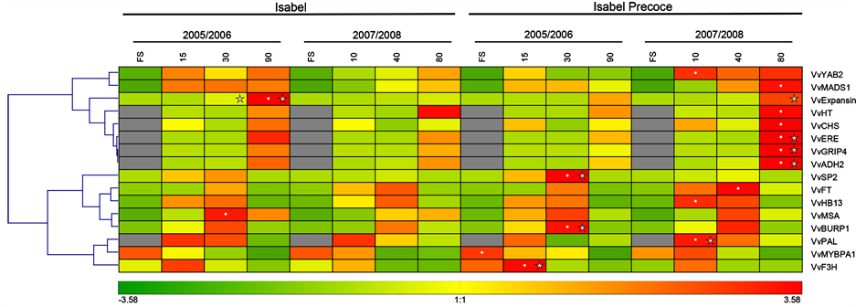 Figure 3. Hierarchical clustering analysis of gene expression in “Isabel” and “Isabel Precoce” during fruit development for selected candidate genes (see Table 2 for details). Average intensity values are represented by a color scale for samples corresponding to fruit set (FS), 15, 30 and 90 DAFS for the growing season of 2005/2006 and fruit set (FS), 10, 40 and 80 DAFS for the growing season of 2007/2008. Expression analyses were performed by real-time PCR and relative gene expression data were normalized with VvActin and VvGAPDH. White points indicate the sample with absolute maximum expression for a gene measured in the experiment. Stars indicate statistical difference (p ≤ 0.05) between cultivars for the correspondent sample. Grey boxes indicate absence of gene expression.