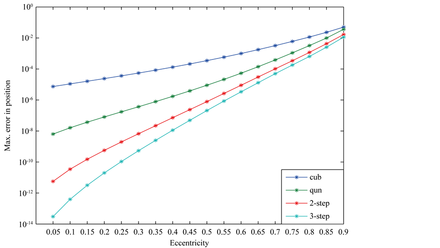 From Figure 1, we observe a clear pattern; as the eccentricity increases, the maximum error in the position also increases. The variation in the error is understandable, because the error depends upon the eccentricity. To illustrate this fact, recall that the analytical solution to the Kepler problem is given by