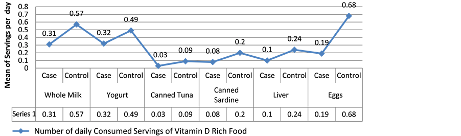 Figure 1 shows the mean of servings intake of Vitamin D rich food, it is obvious that cases were consumed less servings of Vitamin D rich food including whole milk, yogurt, tuna, sardine, liver, and eggs when compared with controls, that differences were statically significant for all values (P < 0.05).